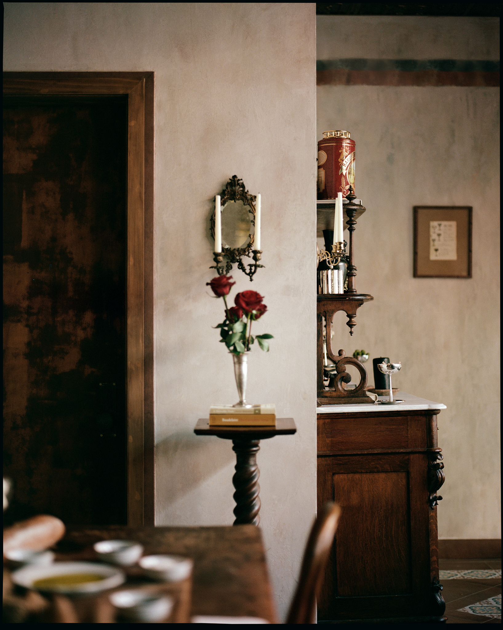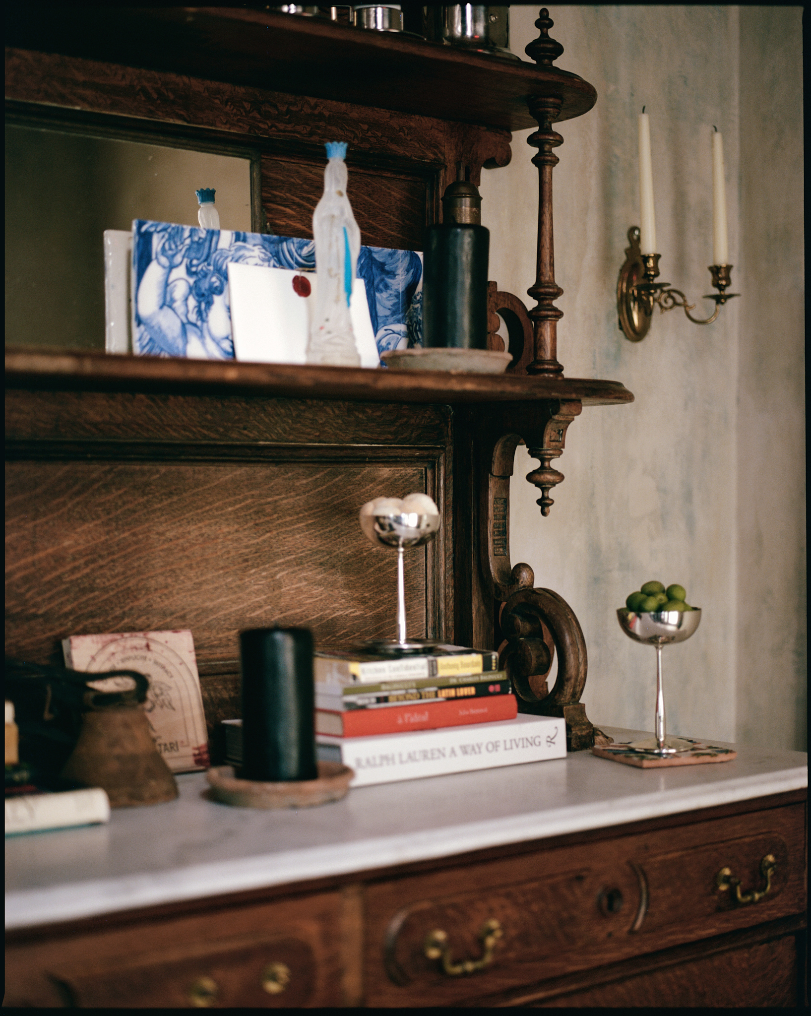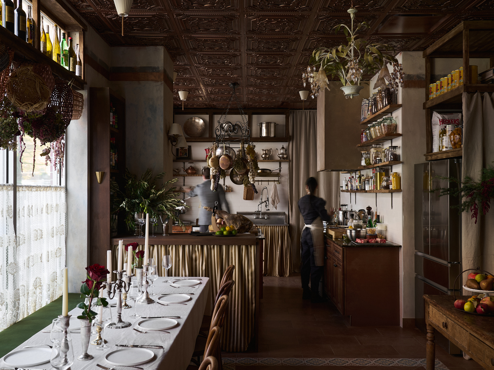 The design draws from Old New York, infused with Portuguese and Southern Italian sensibilities — beauty in imperfection, comfort in tradition, and materials shaped by hand. Plaster walls were painted by a Brooklyn craftsman, and Portuguese floor tiles were laid by Daniel's father, weaving lineage and craft into the architecture itself. The studio softened up the space with layers of Italian fabrics, antique objects, family heirlooms, and everyday materials hung from walls and beams.