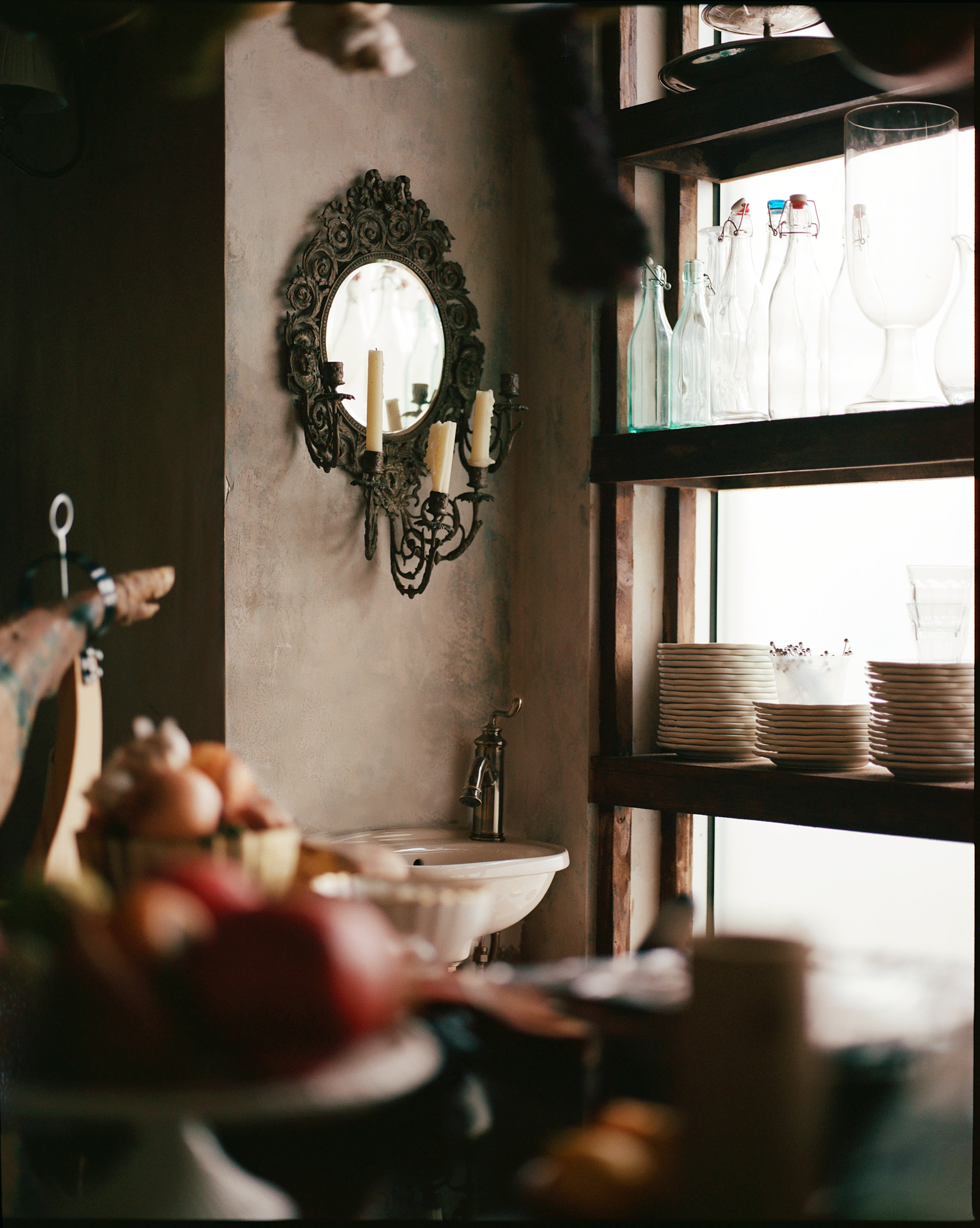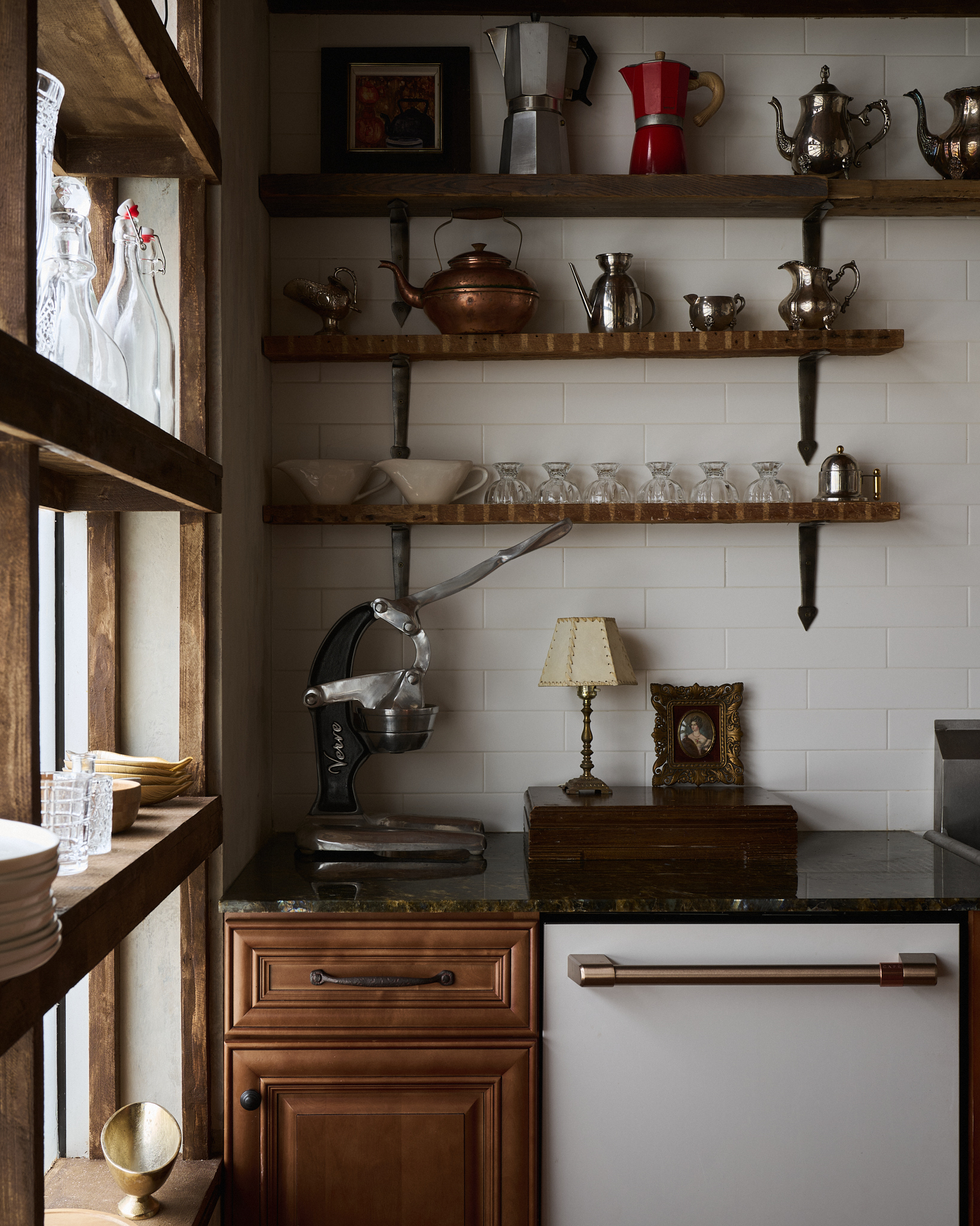 For a busy catering and styling atelier, an abundance of dishes, trays, vases, and flatware is essential and unavoidable. To organize this collection within a compact footprint, the studio designed custom shelving along the windows and perimeter, maximizing both function and display. Silk curtains and sink skirts conceal utilitarian areas (from storage beneath the counters to access points for refrigeration), maintaining a sense of softness throughout. At its core, the space remains practical and hardworking, designed to support the daily craft of creating and sharing food with care.