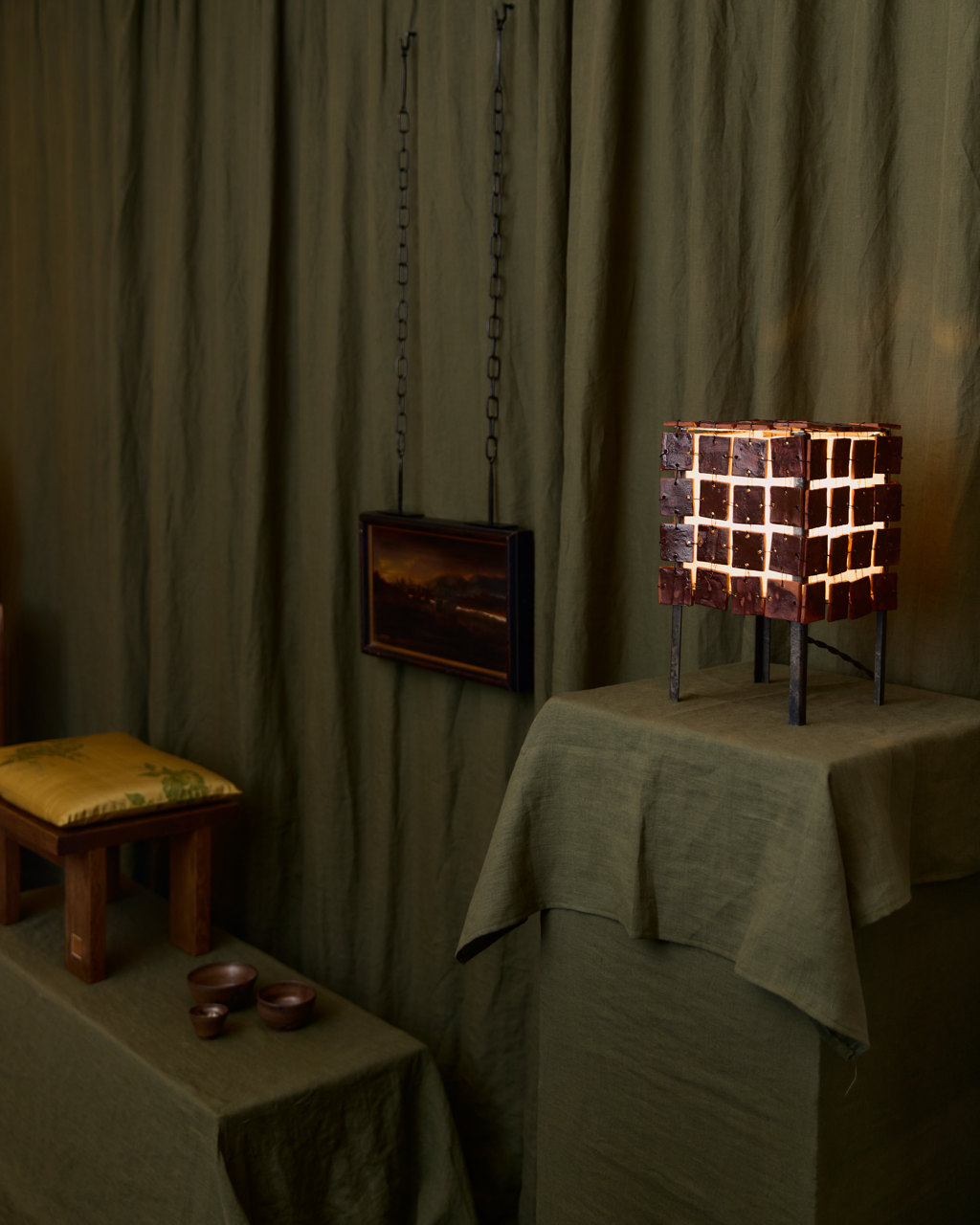 All-sided linked ceramic form with a hand-patinated metal base, softened by a washi paper diffuser.