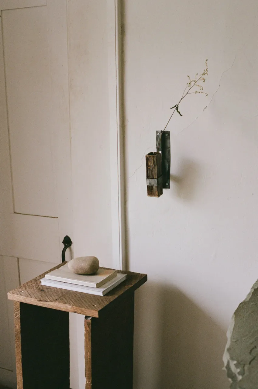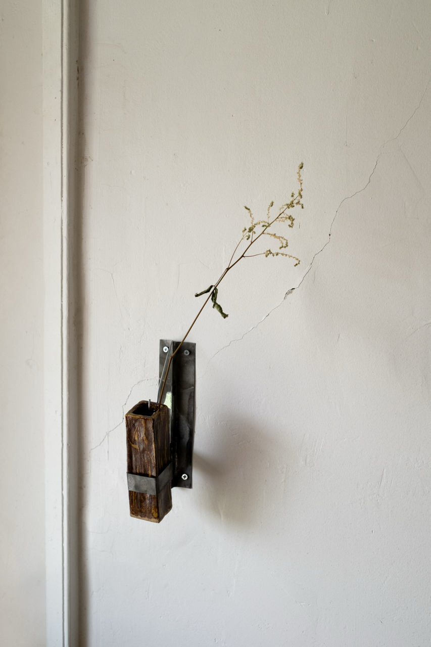 Bracketed at an angle, this hand-brushed ceramic bud vase is sized to suit a single stem of flora. A patinated metal backplate secures the square holder to the wall with four visible screws and a thin steel bracelet. Each piece is coated internally in resin to withstand water.