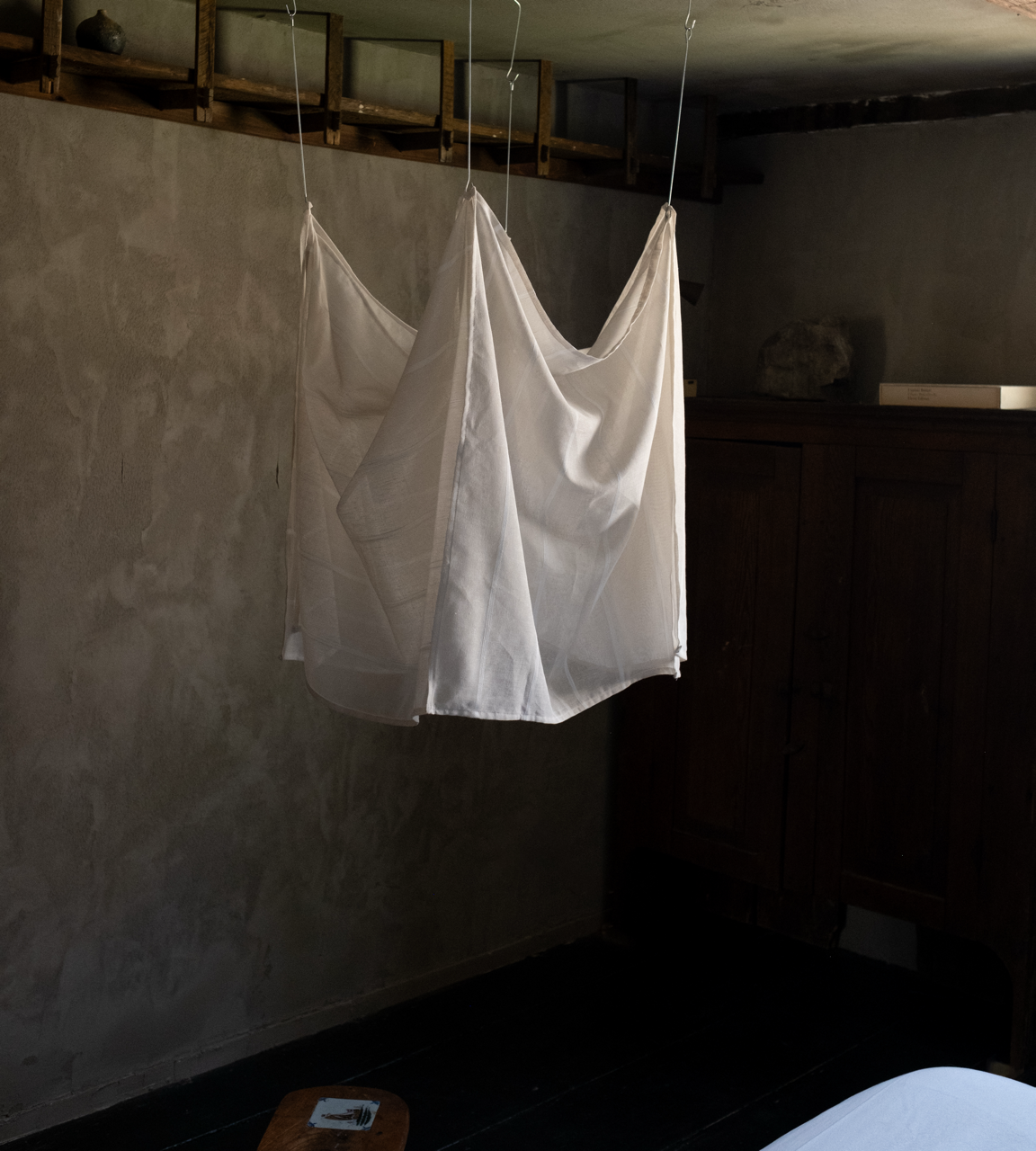 Boroboro. a mended patchwork pendant hung from four corners; a patinated metal canopy. Customizable dimensions and fabrics, as well as hard-wired and plug-in options are available.