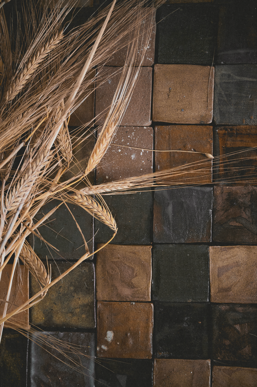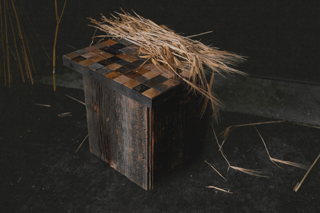Hand-brushed ceramic tiles top a vintage barn wood base in this side table bordered in steel. Visible screws painted in black can be seen tracing the curvature of the piece. Base can be customized in wood stain of choice.