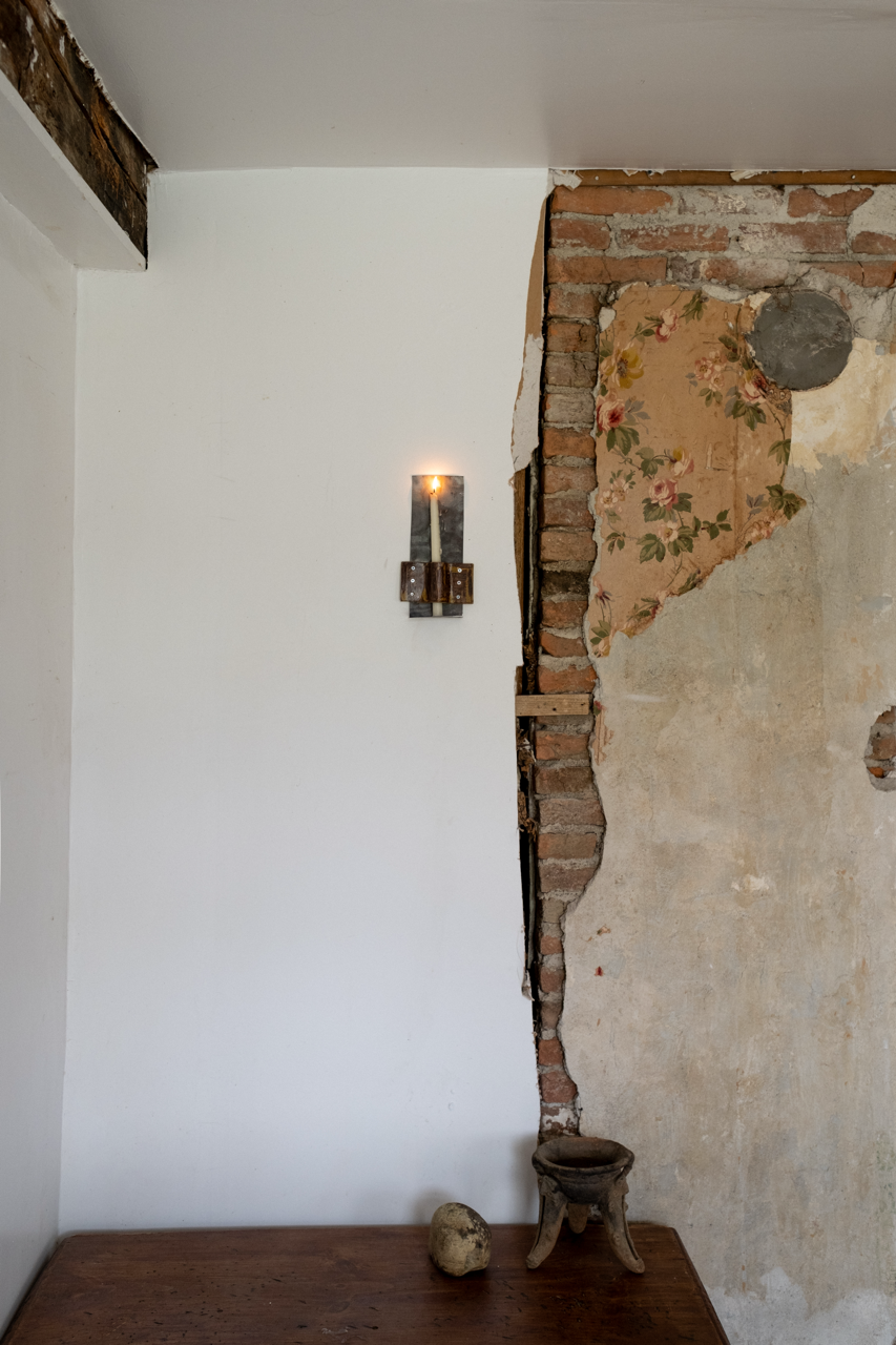 A backplate of bent steel holds a single candle upright in this old-world sconce. Six visible screws secure the hand-painted ceramic bracket to the metal sheet, the element of the object that prevents the flame of the candle from blackening the wall. Wax will drip with reckless abandon.