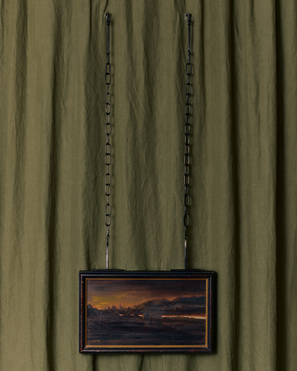 Each piece features a hand-foraged iron chain — adjustable in length — and sculptural hanger screws that mount directly into the wall. Designed as an alternative to traditional picture hooks, the iron brackets cradle artwork securely within its frame while allowing it to float slightly off the wall, casting a subtle shadow for a quiet, dimensional effect. A minimal gesture with a strong presence.